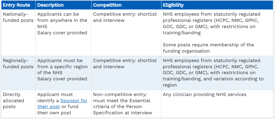 There are 3 entry routes to this fellowship for NHS clinicians. All 3 routes use the same application form. Applicants are entered into appropriate national and regional applicant pools automatically based on application details.