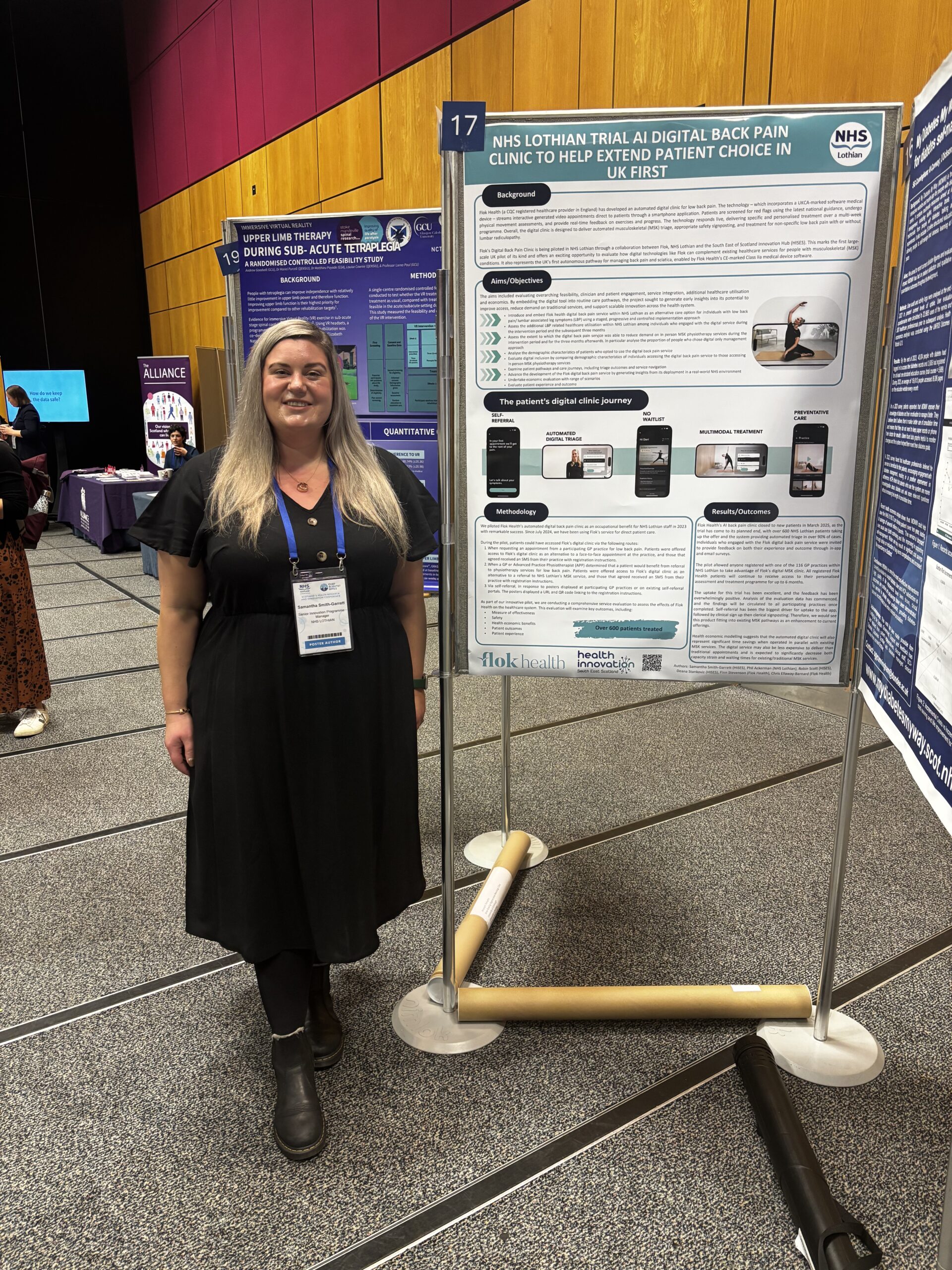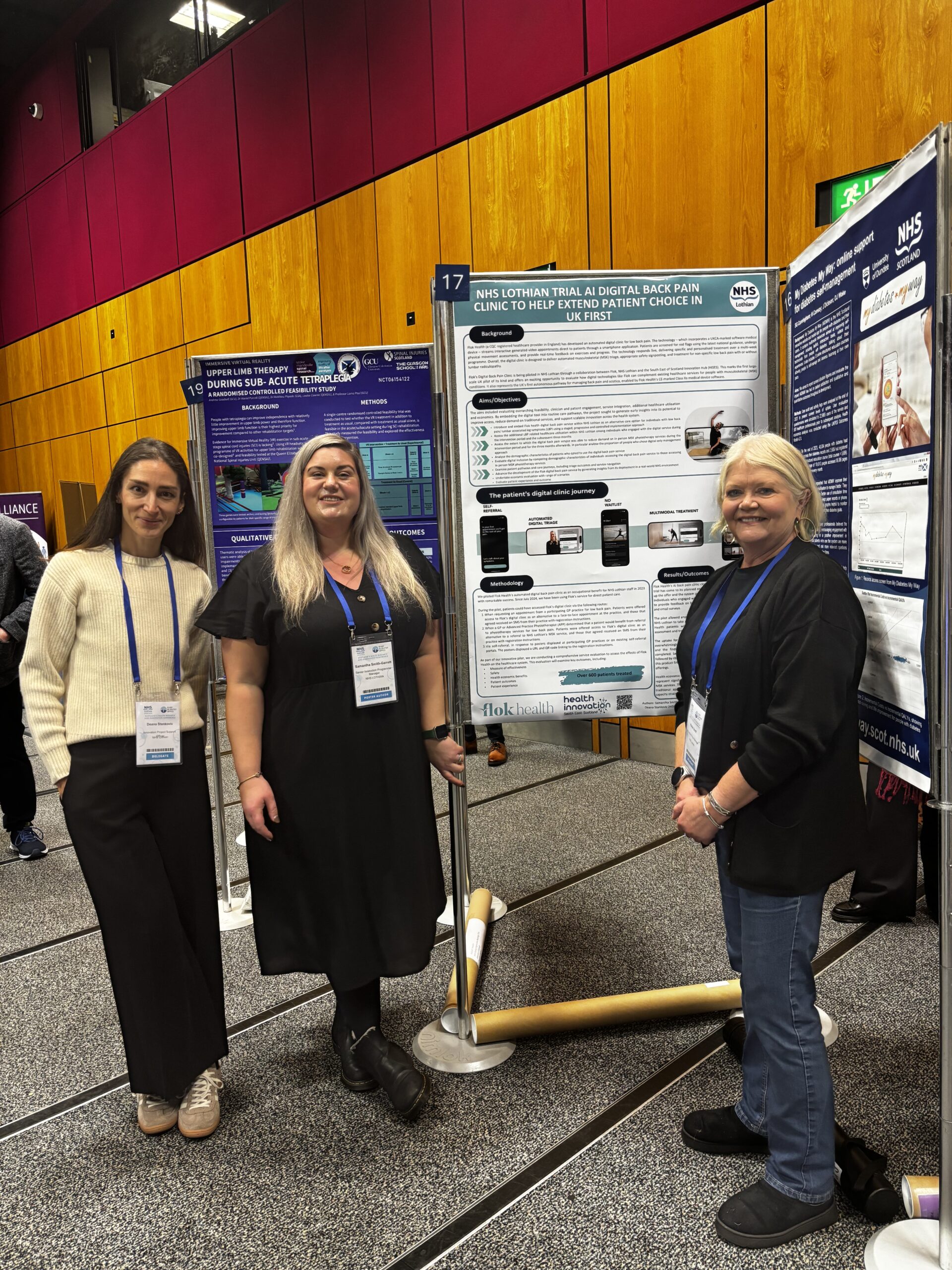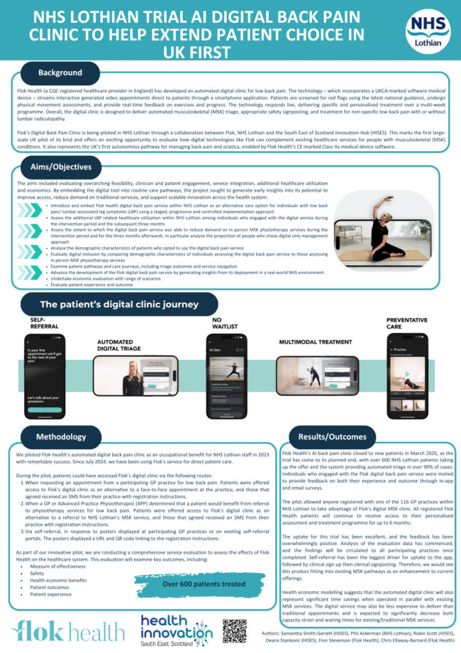 The poster showcased the UK’s first large-scale pilot of a new AI-powered physiotherapy clinic, which provides same-day appointments for back pain with zero waitlist via a smartphone app. NHS Lothian was the first NHS organisation in the UK to make the new AI clinic, called Flok Health available to patients across a range of community healthcare settings. The clinic has been created by a team of physiotherapy and AI experts in Cambridge and is the first digital MSK clinic to have been approved by the Care Quality Commission (CQC). The new service was deployed as a collaboration between NHS Lothian, Flok Health, and HISES.