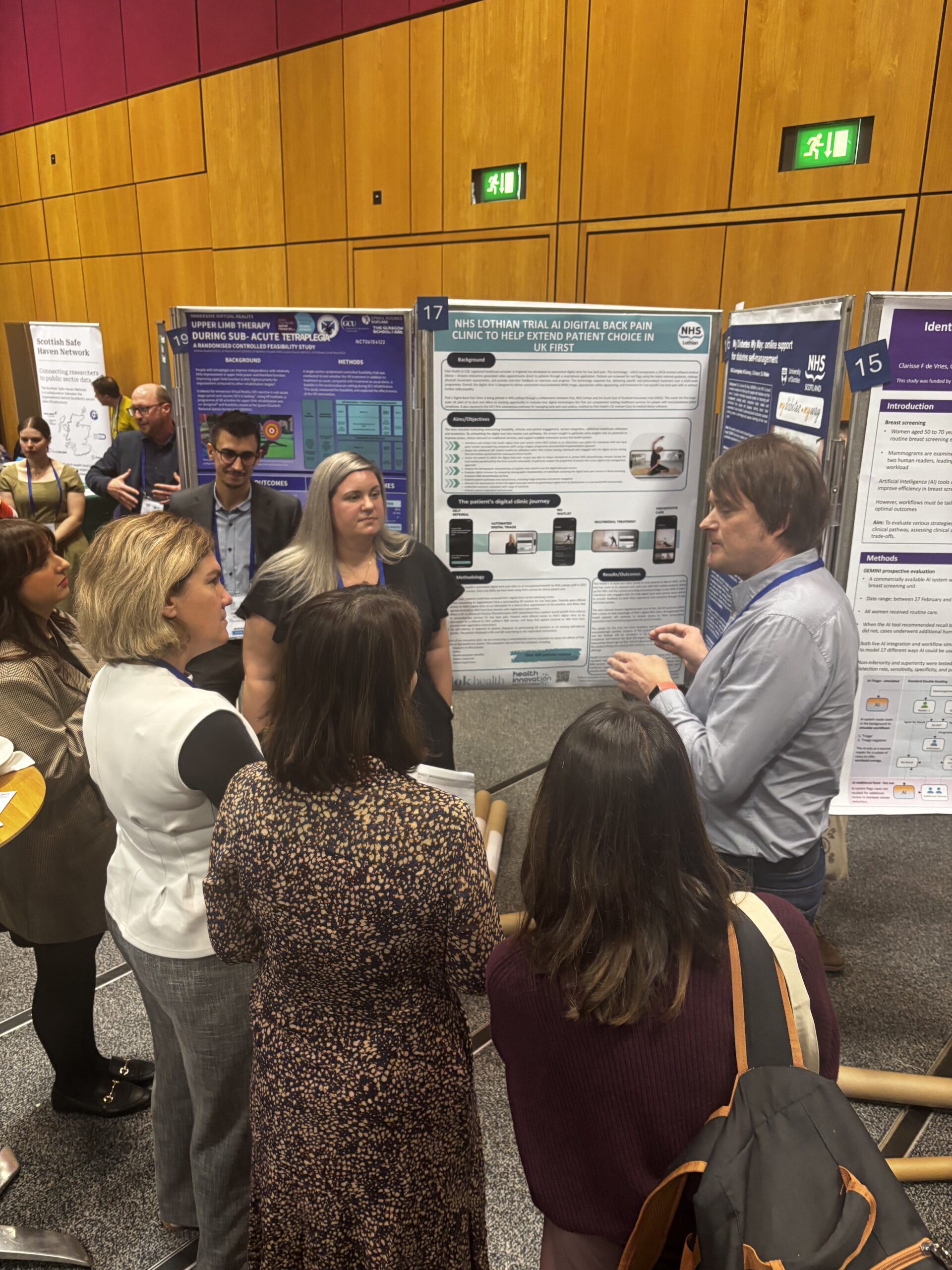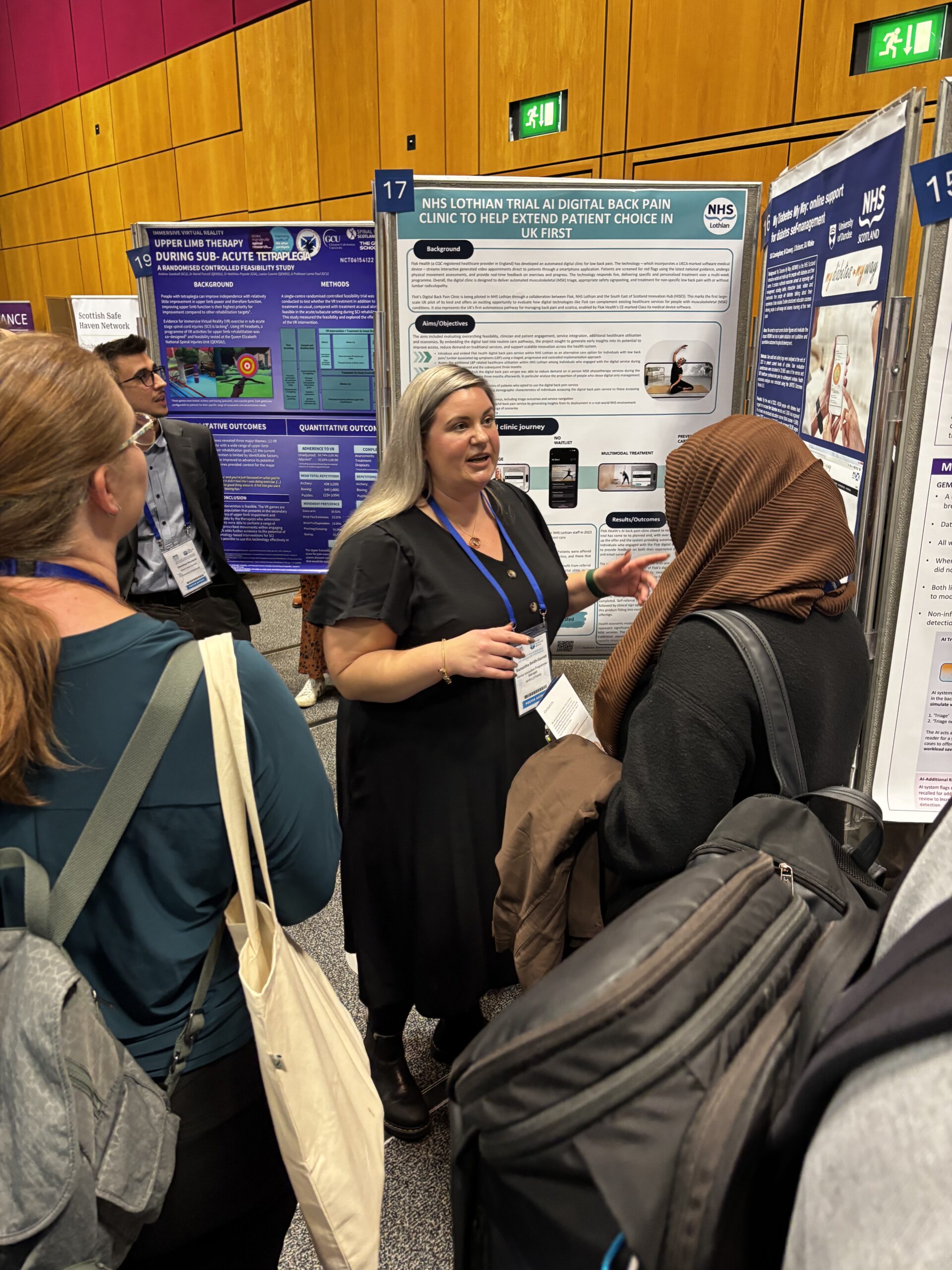 HISES also contributed to the conference with a poster presentation showcasing the outcomes of a pioneering pilot project: the Flok Health Digital Back Pain Clinic, trialled within NHS Lothian. Samantha Smith-Garrett, Senior Innovation Programme Manager presented the poster during a moderated poster walk round under the topic of Digital Health & AI. All presenters had two minutes to summarise their work and take questions from our poster scorers/audience.